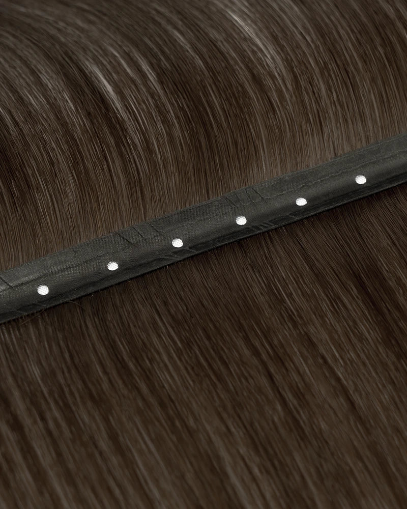 Crafted with a ultra-flat, flexible PU base, these semi-permanent extensions feature strategically placed butterfly holes. Each pair of holes works with a single microbead, allowing stylists to secure the weft firmly while evenly distributing weight — minimizing tension and maximizing comfort, even on fine or delicate hair.